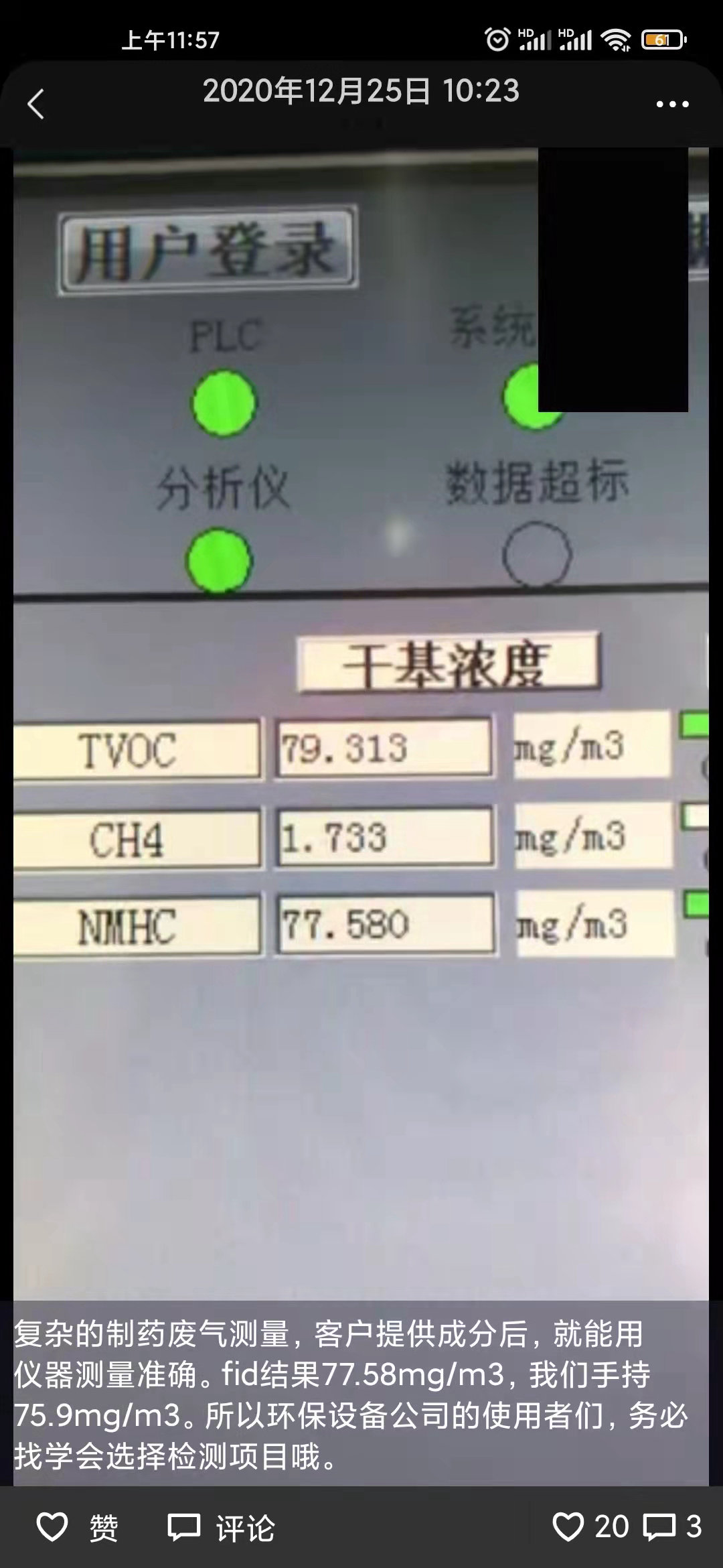 然后企业恰好安装了FID在线监测,结果77.58毫克每立方米。如图三: